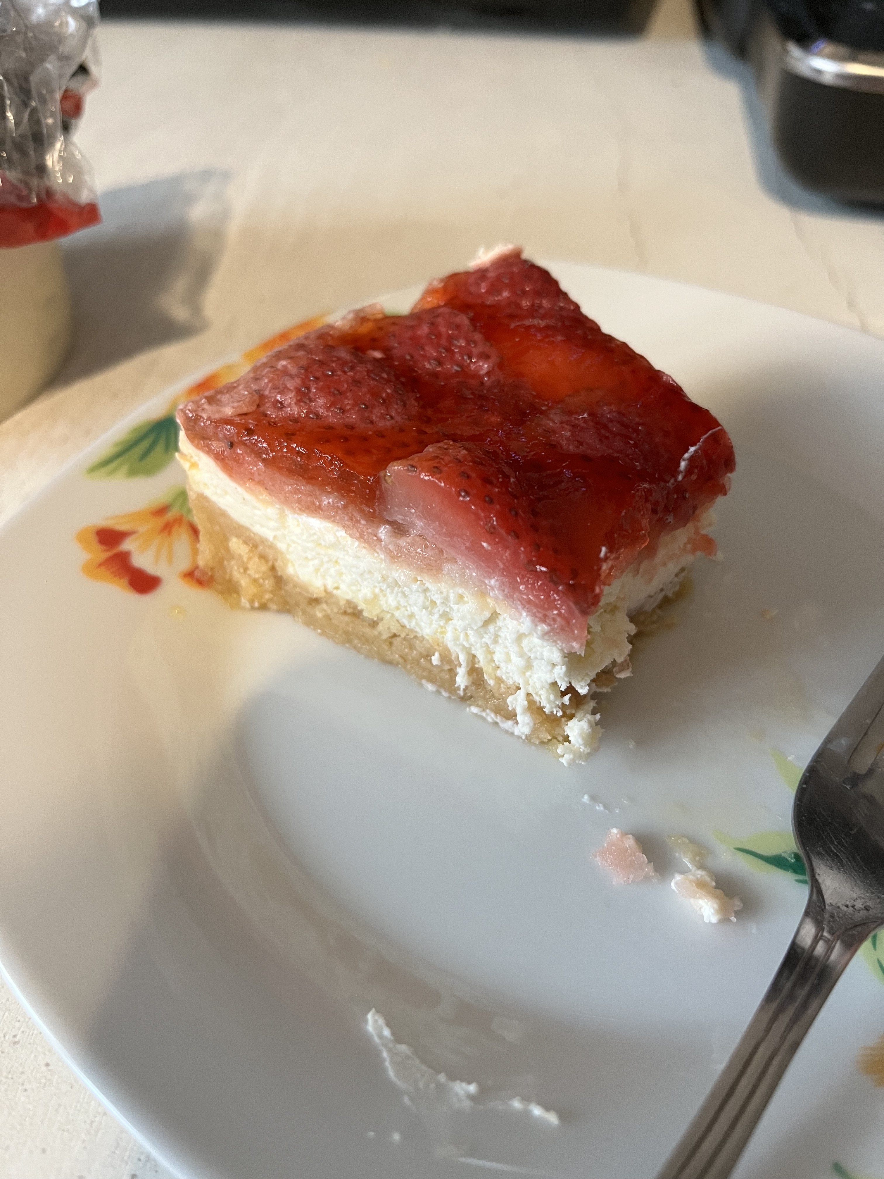 Мой любимейший чизкейк с толстым хрустящим коржом. Пробовала много чизкейков здесь,но в этом почему-то всё особенно вкусно,и сам крем и коржа такого больше не встречала и вкуснейшая клубничка