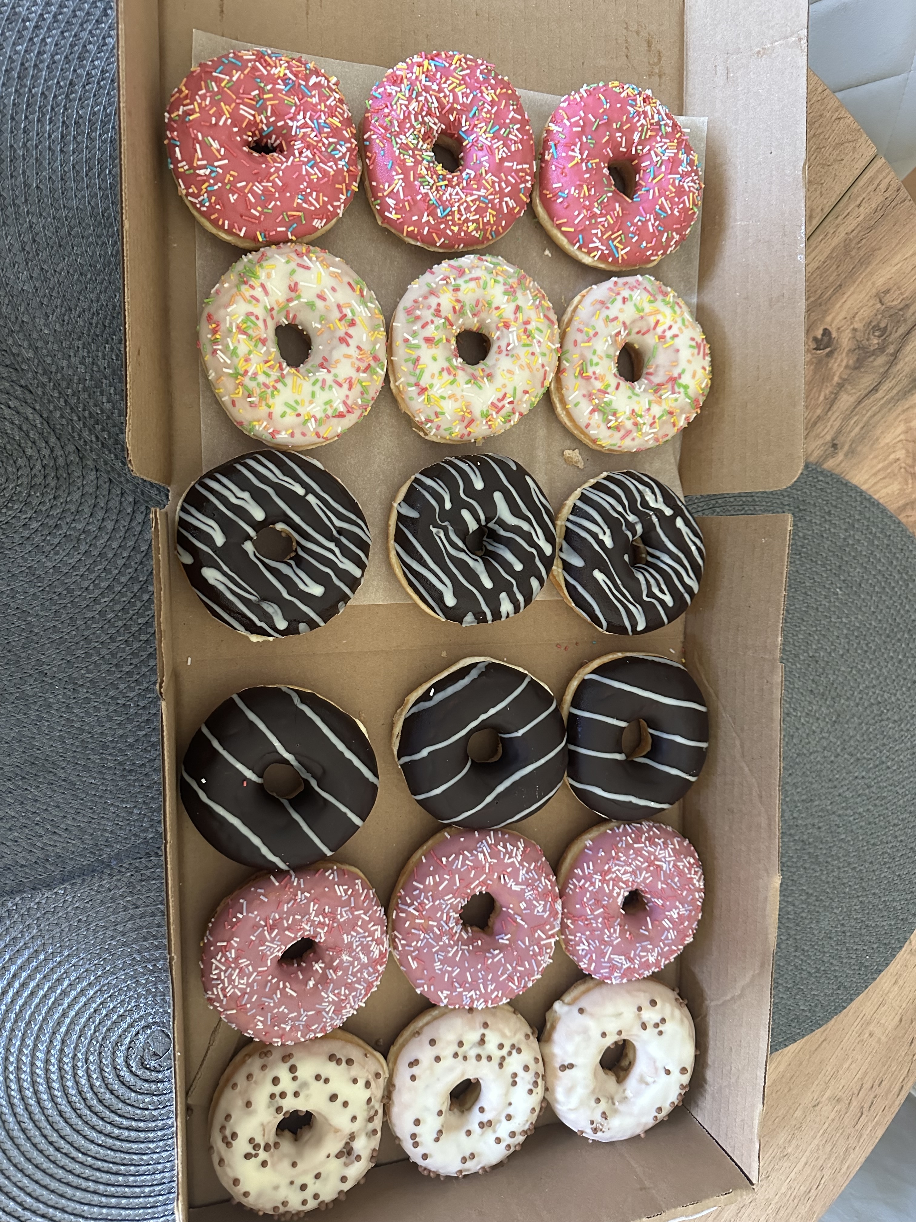 Одна из наилучших альтернатив для "проставиться на работе". Это не однотипный торт, который непонятно съедите ли Вы с коллегами или, наоборот, не хватит. И не пиццы-пироги, которые, если не съесть сразу, вечером уже не аппетитные. 4, 9, 18 человек вас в коллективе.. Не важно. Пончики очень вкусные, сытные, в них много начинки и, что приятно, от них не сводит зубы. Приходят замороженными, но через 20 минут комнатной температуры натсвежайши. Не мокрые! Сейчас брала на работу, вместо торта в честь дня рождения, а ранее брала домой. Закидываешь коробку в морозилку и при желании, перед ужином достаешь пару штук. Отличная позиция. Раза 4 заказывала. И цена приятная, как я считаю. Рекомендую!