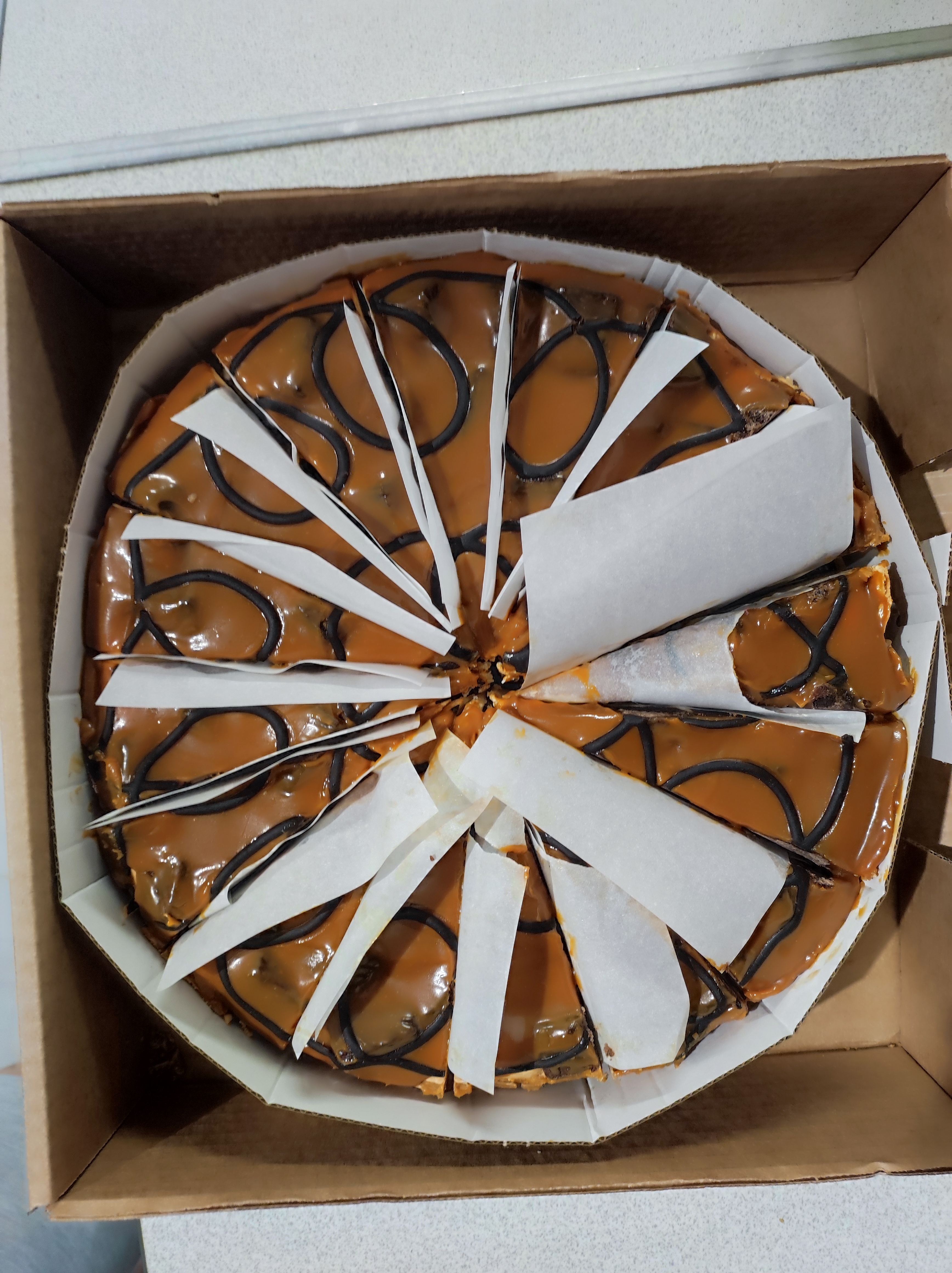 Торт был чуть помят, но нарезан на порции. Вкус просто шикарен. Плотный, сладкий, восхитительный. Карамель сверху просто космос. Правда, он очень сытный, больше 2-х кусков съесть не получиться. Сочетание с кофе самое удачное. Я довольна. Спасибо