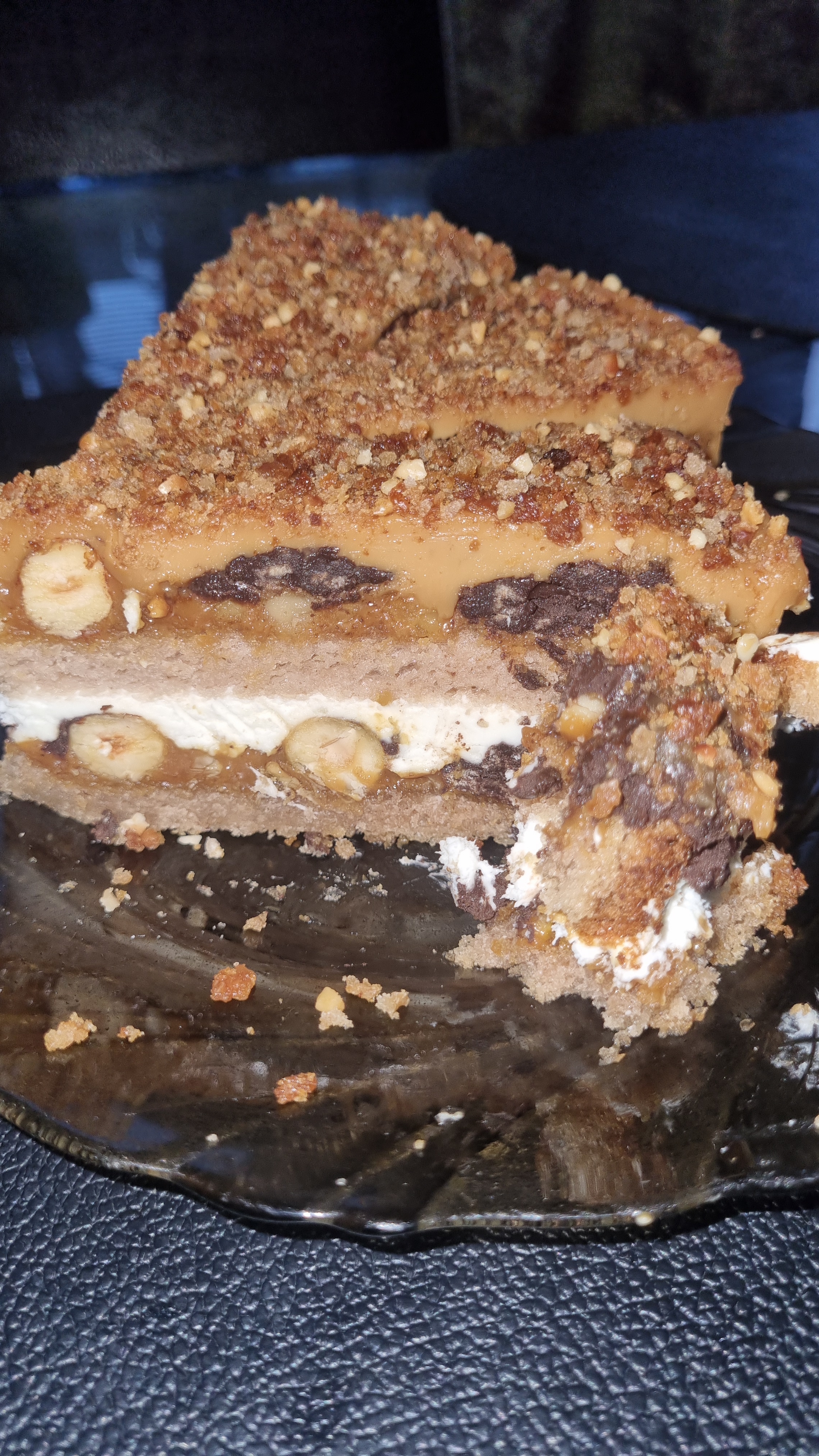 Между двух бисквитов прослойка из нежного крема, банановый ганаш, фундук и шоколадные слои. Торт залит слоем сливочной карамели и украшен бисквитной крошкой и дроблёным орехом.