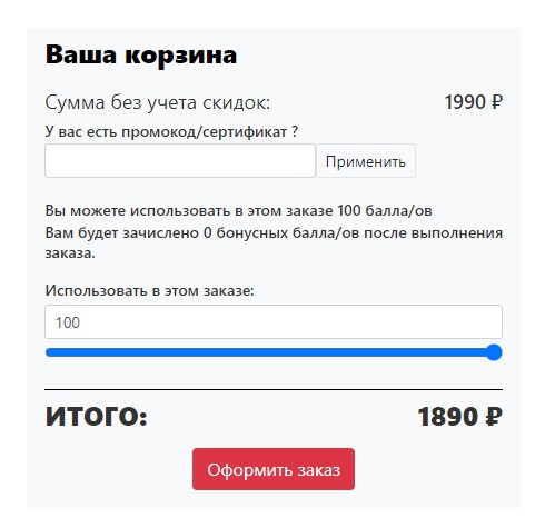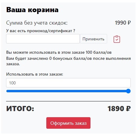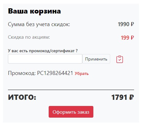 введенным промокодом и рассчитанной скидкой на заказ. Итоговая сумма будет пересчитана с учетом скидки по