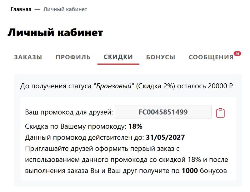Скопируйте из раздела «Скидки» Ваш персональный промокод для друзей и отправьте его другу