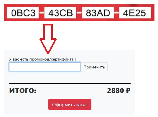 В поле "Промокод/Сертификат" введите код сертификата с изображения или из текста письма, если промокод действителен, он отобразится после поля "Итого" и сумма к оплате будет пересичитана.